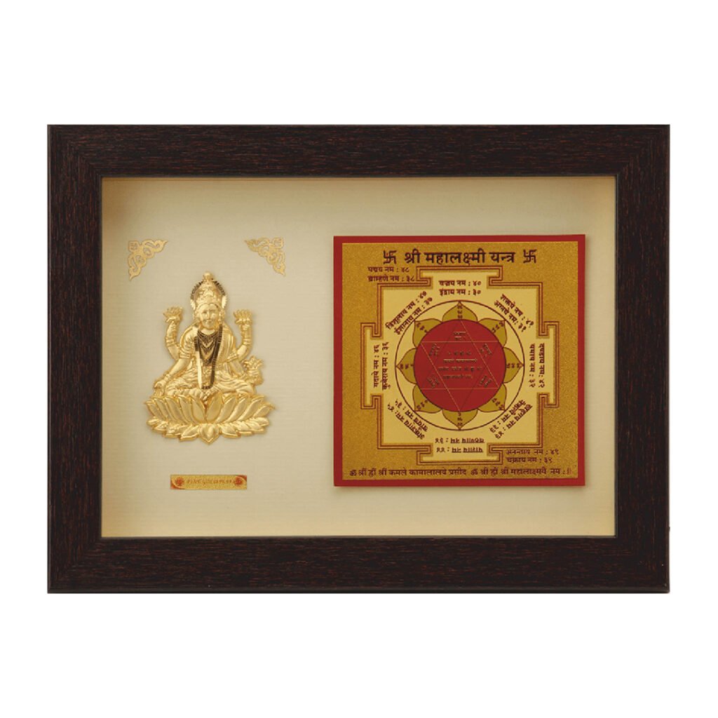 The gold foil Shri Mahalaxmi Yantra frame is a sacred and powerful symbol of the Hindu goddess of wealth and prosperity, Mahalaxmi. With its intricate design and shimmering golden accents, it attracts abundance, good fortune, and blessings. This art piece symbolizes material and spiritual wealth, inviting the grace and blessings of Goddess Mahalaxmi into your life. Embrace its energy and experience the positive vibrations it radiates.