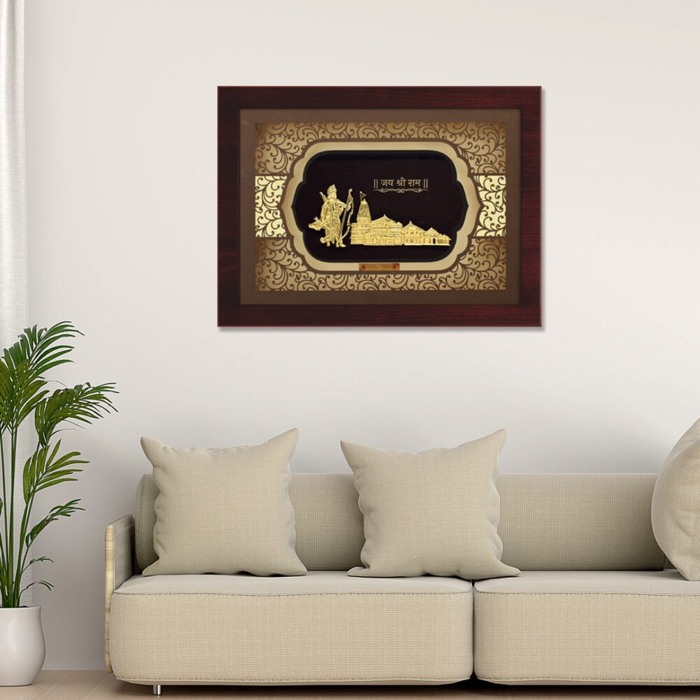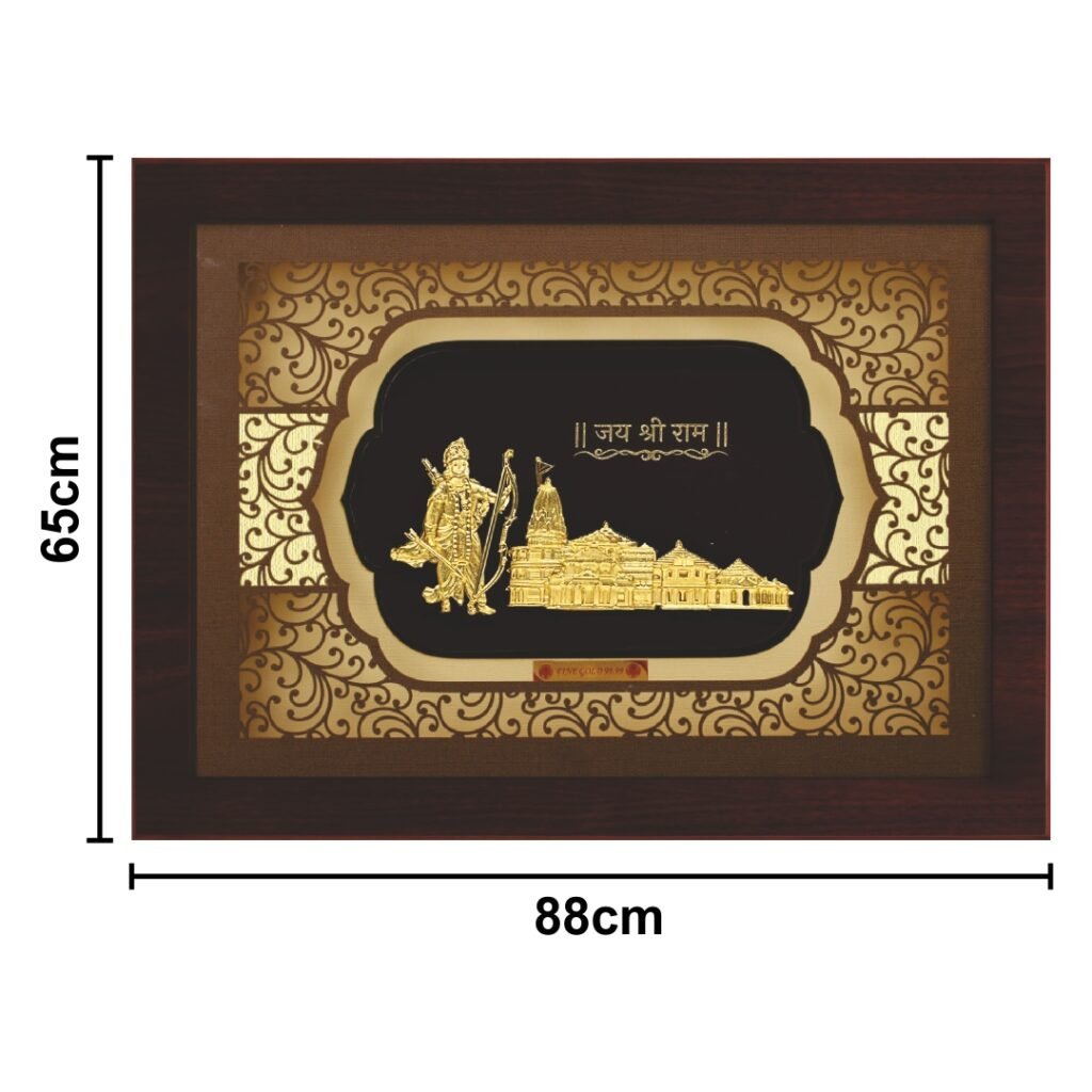 Celebrate devotion and heritage with the magnificent Ayodhya Temple with Ram Ji Elite Collection Frame by Aarya24kt. Crafted with intricate gold foil detailing, it beautifully captures Lord Ram with his bow and the grand Shri Ram Janmabhoomi Temple. Symbolizing virtue and divine authority, this masterpiece radiates spiritual grandeur. Ideal for large pooja halls, homes, and spiritual centers, it also makes a perfect gift for religious ceremonies, housewarmings, Diwali, and Ram Navami.