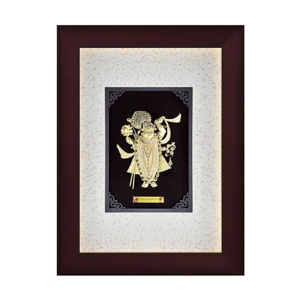 Adorn your space with divine grace through Aarya24kt’s Big Carving Solid Shreenath Ji Frame. Crafted with intricate detailing and pure gold foil, this sacred frame radiates serenity and devotion. Shreenath Ji, a revered form of Lord Krishna, is worshipped for prosperity and protection, often placed in homes and temples. His blessings are believed to bring harmony, wealth, and spiritual upliftment. Elevate your surroundings with the timeless beauty and blessings of Shreenath Ji, encapsulated in divine gold.
