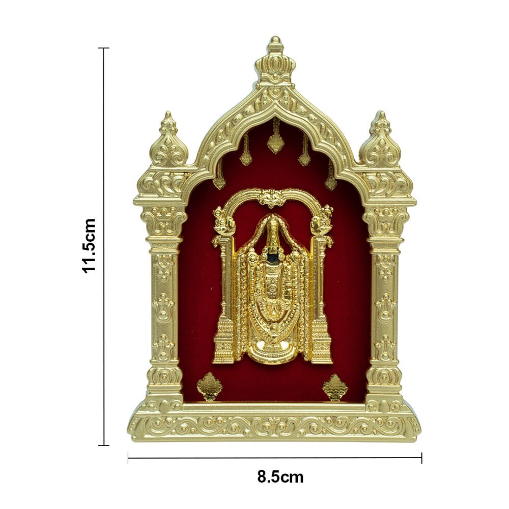 Sacred Gold Foil Art: The centerpiece is a stunning Lord Balaji (Venkateswara) idol, crafted with exquisite detail in 24kt Gold Foil. Set against a rich maroon backdrop and framed in a golden arch, it radiates a divine aura.