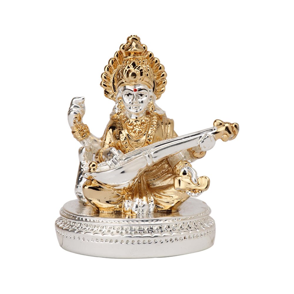 Experience divine blessings with the Aarya24kt Gold-Plated Saraswati Idol, seated gracefully on a round base. Intricately designed, this exquisite 5.5cm x 4cm x 7cm idol radiates wisdom, purity, and knowledge. Perfect for pooja rooms, workspaces, and study desks, it brings positivity and intellect to any space. A cherished gift for students, scholars, and festive occasions, this masterpiece embodies elegance and spiritual grace.