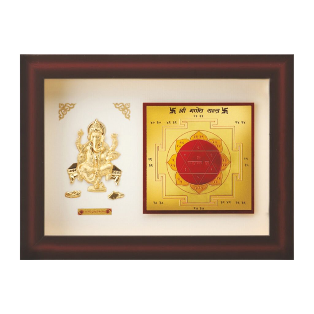 The gold foil Ganesh Ji with Yantra frame showcases the divine presence of Lord Ganesha, accompanied by the sacred Yantra symbol. With its intricate design and shimmering golden accents, it embodies wisdom, prosperity, and obstacle removal. This art piece symbolizes blessings, success, and the divine energy of Lord Ganesha, infusing your space with auspiciousness and spiritual protection. Embrace its radiance and invite the presence of Lord Ganesha into your surroundings.